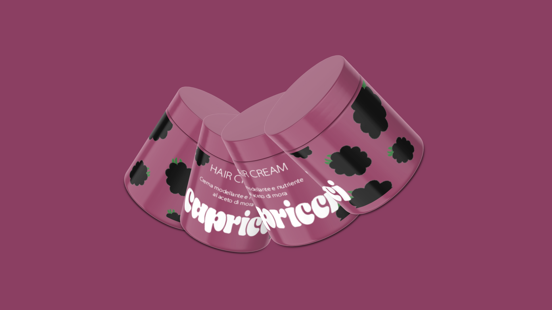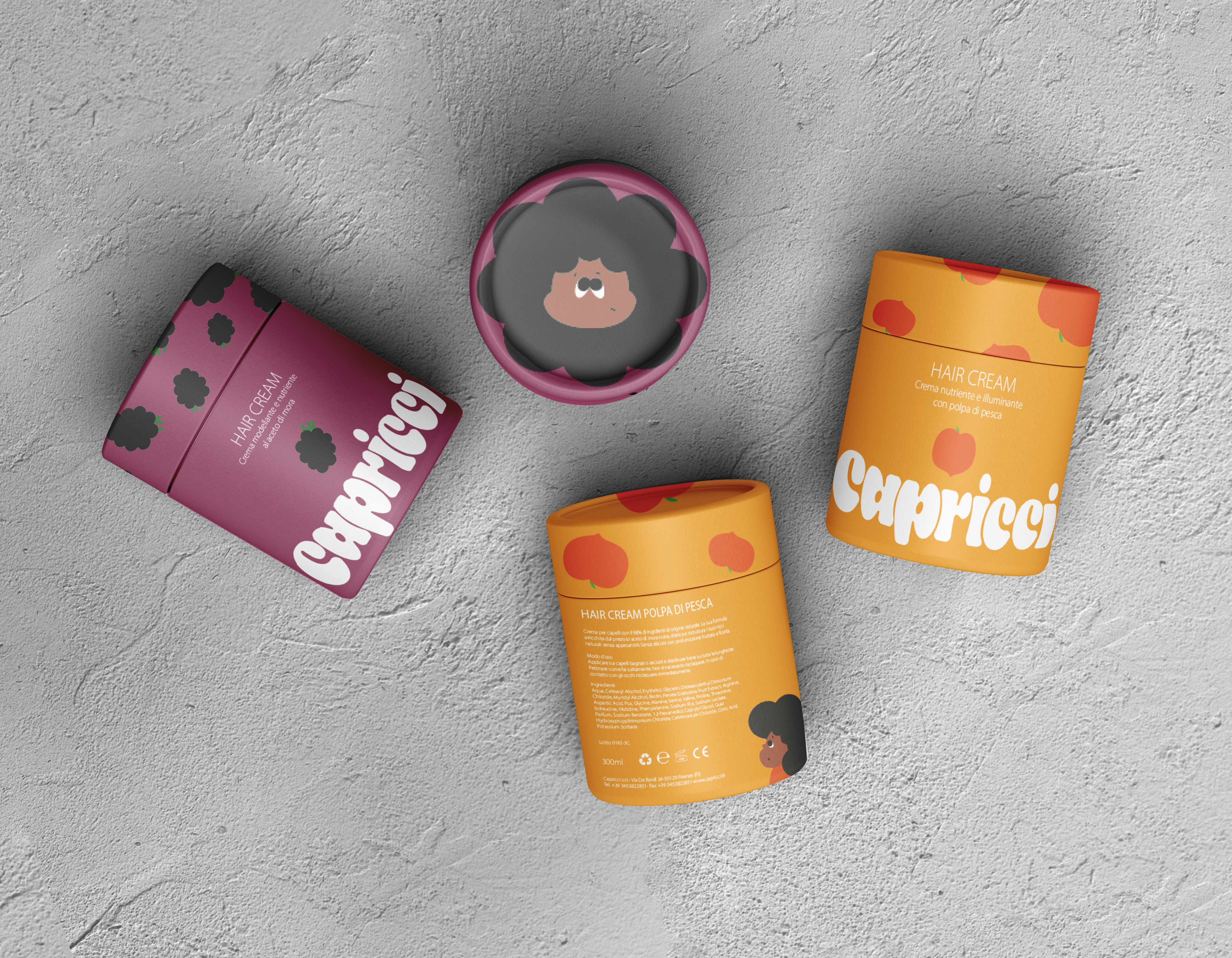 Capricci è un nuovo brand di creme naturali per capelli ricci, pensate per tutti i tipi di riccio. Il marchio adotta uno stile informale e giocoso, pensato per creare empatia e simpatia con il pubblico.